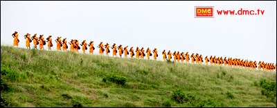 พระธรรมทายาทในโครงการหนึ่งแสนรูป รุ่นที่ 3 ของศูนย์อบรมประจำจังหวัดศรีสะเกษ ได้เริ่มเดินธุดงค์จากวัดโนนม่วง ผ่านตัวเมืองอำเภอกันทรลักษ์ มุ่งหน้าไปพัฒนาวัด นำธรรมะไปสู่ชาวพุทธในชุมชนสองแห่ง คือ ชุมชนวัดบ้านตูมน้อย อำเภอกันทรลักษ์ และสำนักสงฆ์บ้านห้วยตามาย อำเภอเบญจลักษ์ รวมระยะทางกว่า 50 กิโลเมตร ซึ่งขณะที่พระธุดงค์เดินไปอย่างองอาจสง่างามนั้น ก็ทำให้ชาวบ้านชาวเมืองตื่นตาตื่นใจ พนมมือไหว้พระด้วยความตื่นตะลึง ชาวบ้านบางคนถึงกับทนไม่ไหวต้องเข้ามาถามว่า “พระคุณเจ้ามาจากไหนกันครับ แล้วจะธุดงค์ไปที่ไหนหรือครับ” ขนาดแม่ค้าส้มตำยังเร่งตำอย่างแรง เพราะจะรีบเอาส้มตำและไก่ย่างมาใส่บาตรพระธุดงค์ ชาวบ้านต่างบอกว่า ตั้งแต่อยู่ที่นี่มาก็เพิ่งจะมีพระธุดงค์มาโปรดแบบนี้ เป็นบุญตาจริงๆ